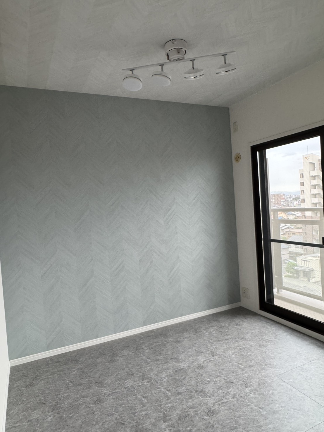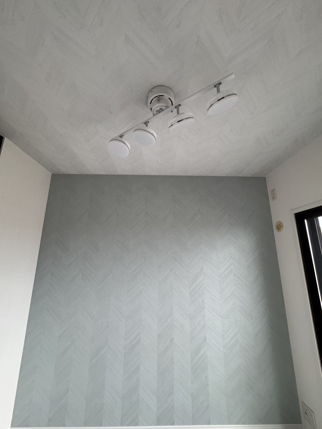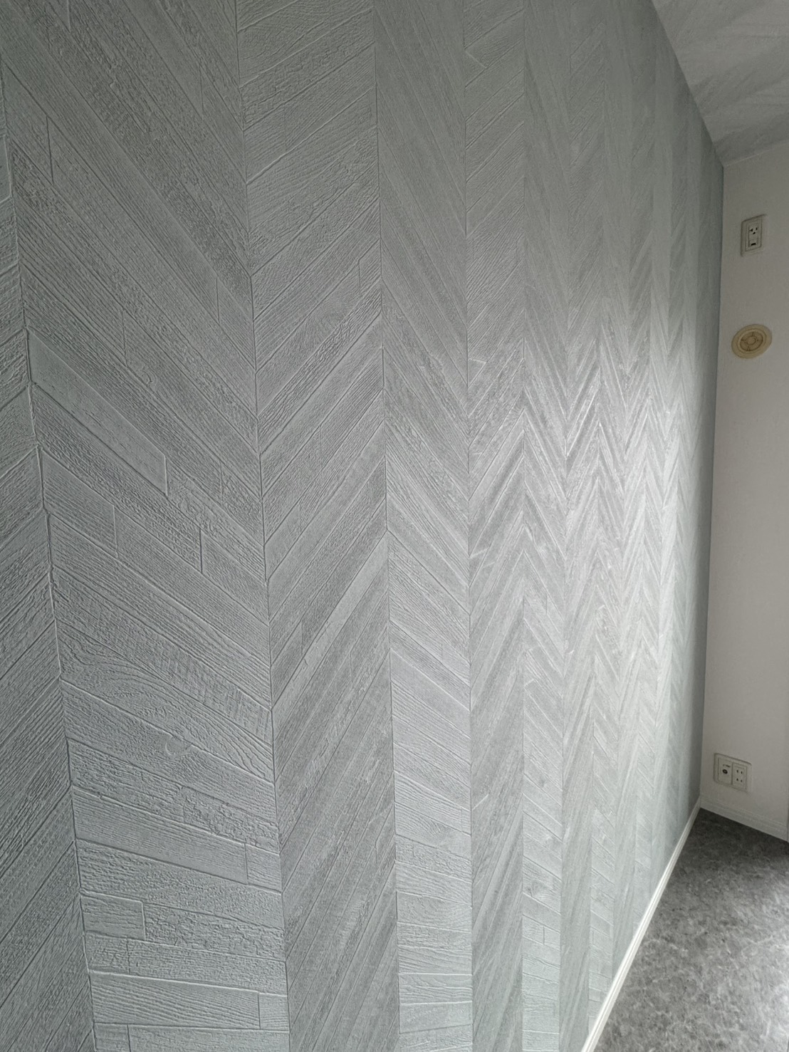 タイル調のフローリングと、ヘリンボーン柄の色違いのクロスをアクセントに使いおしゃれ空間になりました。